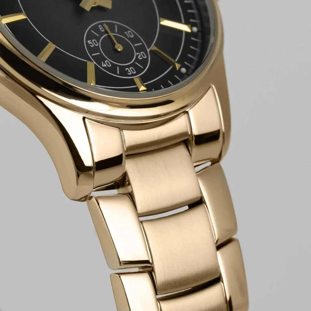 Sárga arany színű PVD bevonatú, foszforeszkáló mutatók és rakott indexek.