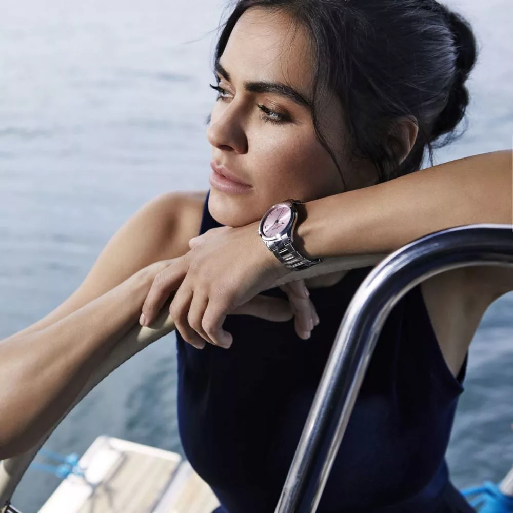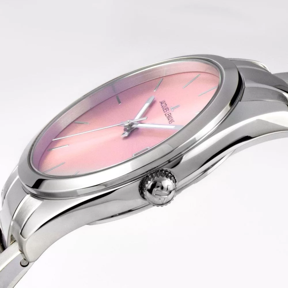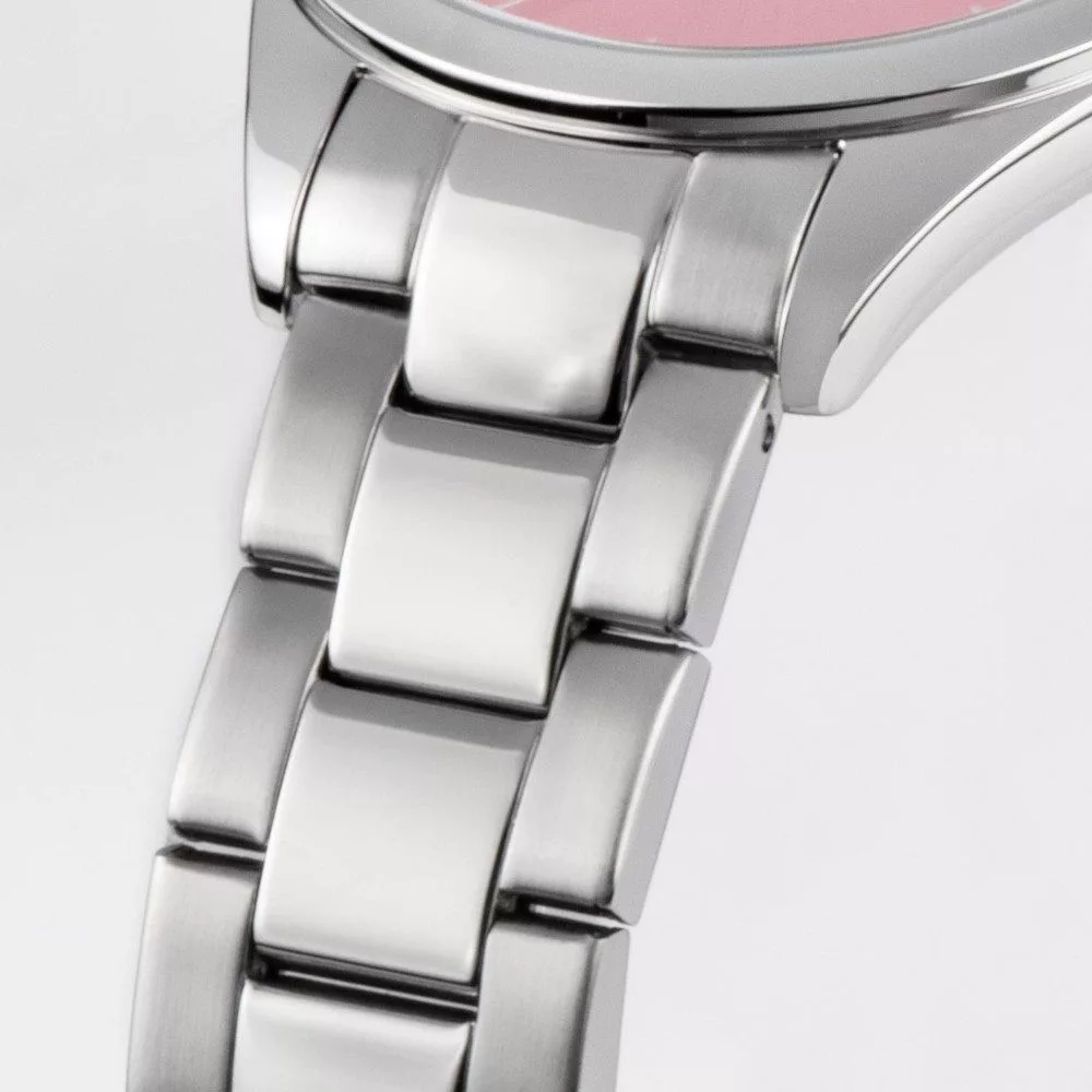 Rózsaszín "sunburst" hatású számlap, dátum kijelzéssel.