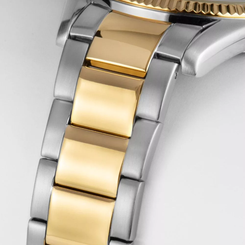 Ezüst színű óratok sárga arany színű "fluted" bordázott lünettával.