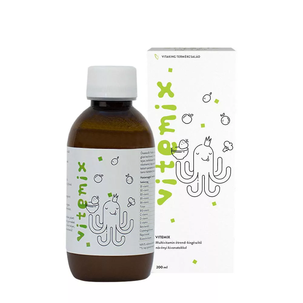 A Vitemix ízletes növényi kivonatok és vitaminok folyékony kombinációja, így a legkisebbek is hamar megszeretik, és könnyen fogyaszthatják. Mi a bajuk a gyereknek a vitaminokkal és étrend-kiegészítőkkel? Az, hogy “fúúúúj” íze van! A Vitemix ízletes növényi kivonatok és vitaminok folyékony kombinációja, így a legkisebbek is hamar megszeretik, és könnyen fogyaszthatják. Olyan fontos vitaminokat tartalmaz, mint a C-vitamin, E-vitamin, D-vitamin, béta karotin (az A-vitamin elővitaminja) és a B-vitamin család összes tagja. Ezen kívül rengeteg répa- búzacsíra- és csipkebogyó kivonat van benne.